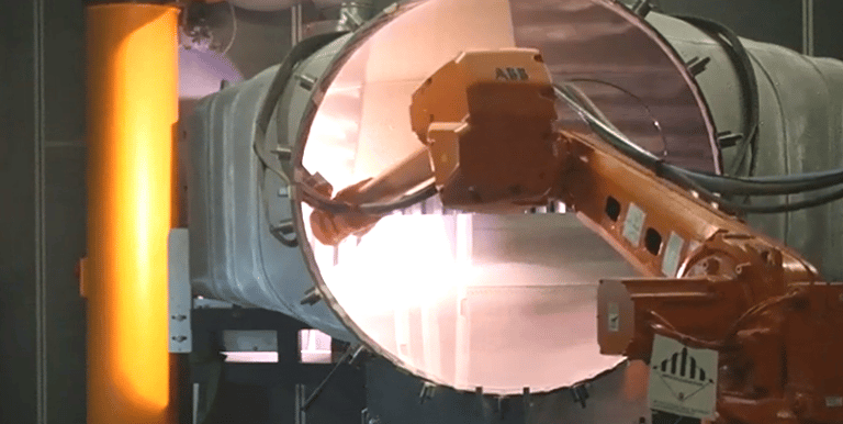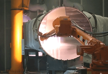 Process: SoftART AG simulated the robot and linear axis inside a detailed model of the Hot Gas Casing. All coating paths were generated offline with validated collision‑free motion, enabling precise internal coating without manual teaching.